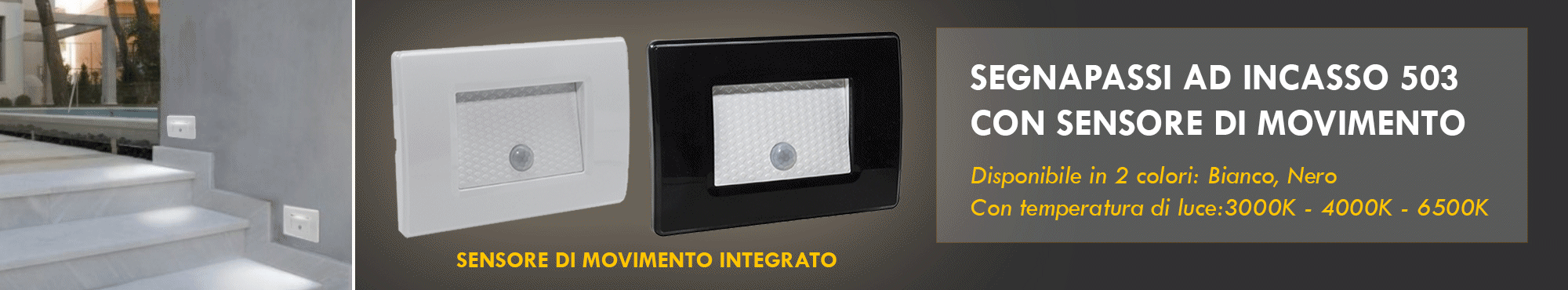 Faretto segnapassi LED dotato di sensore crepuscolare e di movimento adatto per uso interno adatto per l'incasso a parete o muro in cassette 503 (3 posti) dotato di LED integrati per una potenza di 1.3W ideale come luce di sicurezza all'interno di garage, corridoi, ingressi, per l'illuminazione di scale, locali commerciali, uffici ed in tutti quei posti dove si vuole installare una fonte di luce con accensione automatica al passaggio. Si installa facilmente in una cassaforma 503.