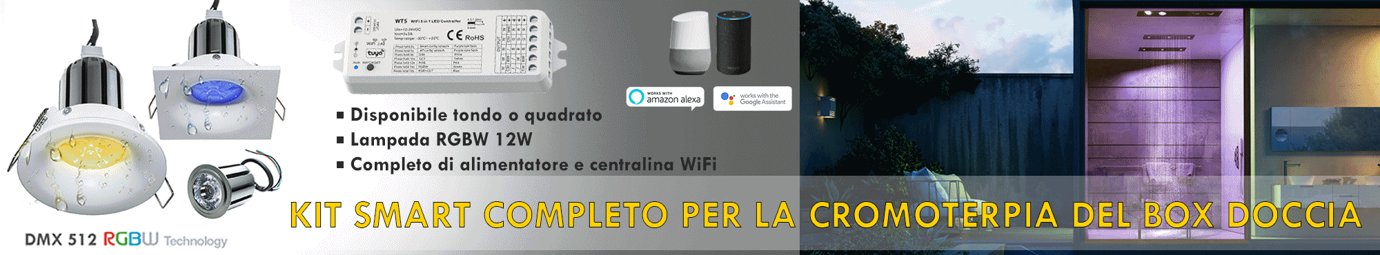 KIT cromoterapia RGBW completo di porta faretto ad incasso IP65 a tenuta stagna, una lampada LED RGBW disponibile con temperatura RGB+3000K luce calda e RGB+4000k luce naturale, una centralina WiFi con controllo vocale compatibile con Amazon Alexa e Google Home ed un alimentatore da 24V dc.