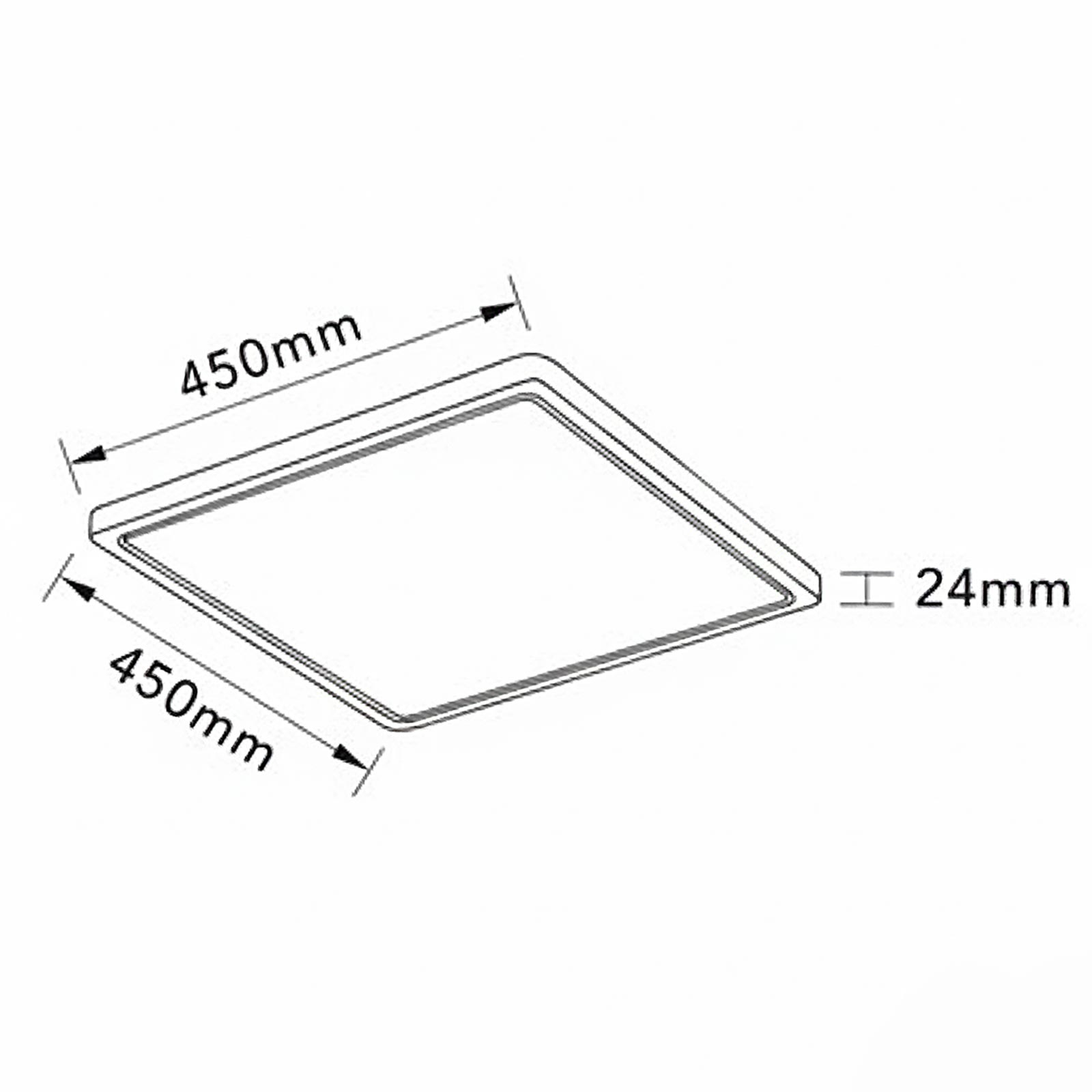 Dimensioni della plafoniera: 450mm x 450mm, Spessore 25mm. Dimensioni base di fissaggio 260mm.
