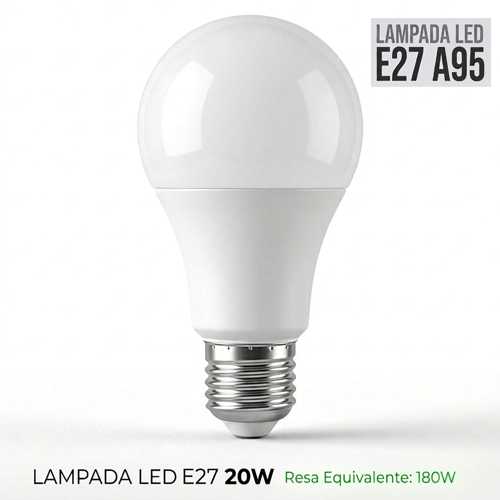 Lampadina A95 a LED con attacco E27 e 20W di potenza con una resa pari 180W delle vecchie lampade ad incandescenza. Ideale per sostituire vecchie lampade oppure potenziare l'illuminazione esistente con questa lampada ad alta luminosità con consumo energetico ridotto, (circa il 90%). Realizzata in termoplastica e policarbonato; non contiene sostanze nocive, quali il mercurio ed il piombo, generalmente presenti nelle vecchie lampadine.