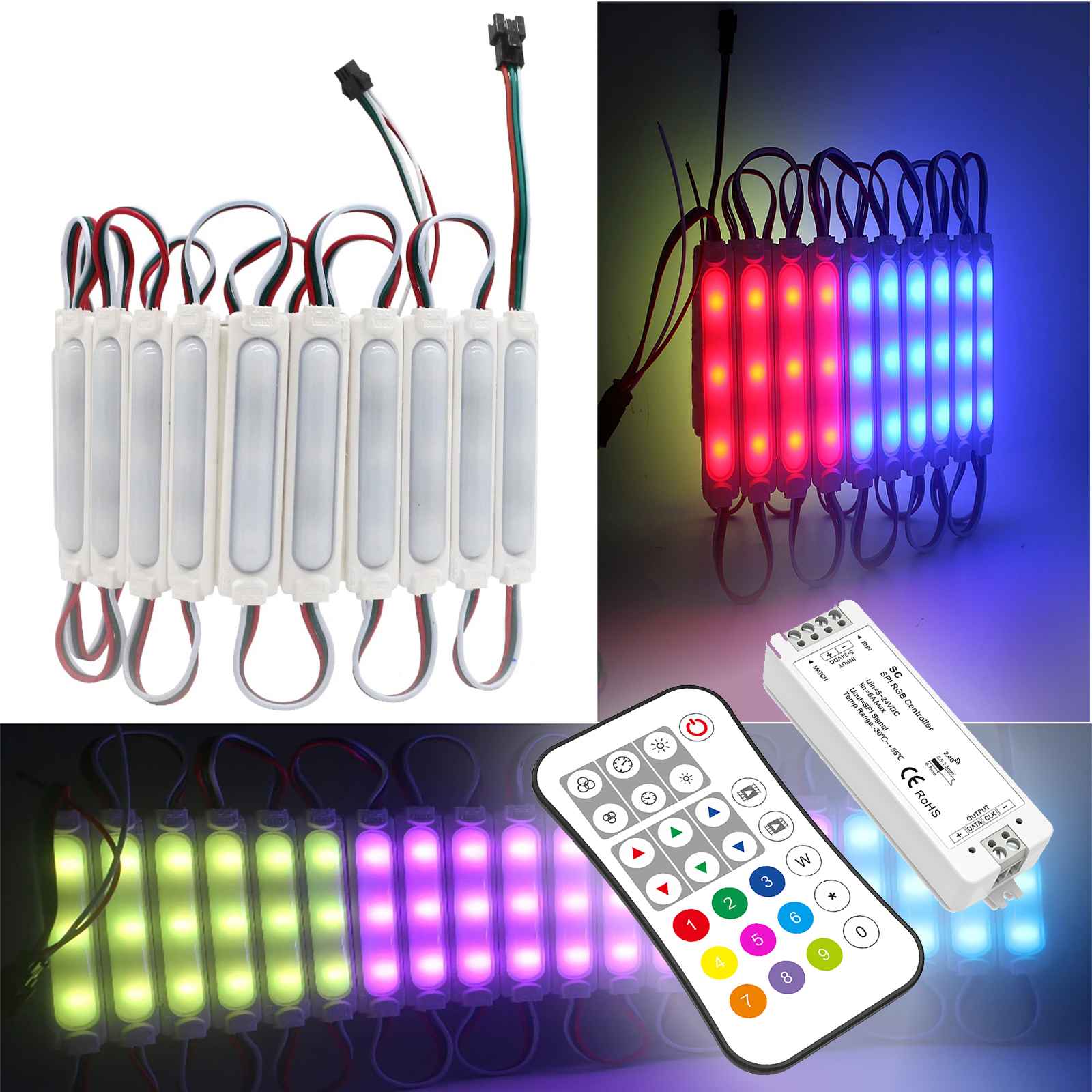 Modulo LED RGB digitale completo di centralina e telecomando per gestire tutti gli effetti ideale come retroilluminazione di tabelle, tabelloni, insegne pubblicitarie, insegne di negozi, tabelloni pubblicitari, all'interno di vetrine. Il modulo è composto da 20 LED da 1W con potenza totale di 20W ed è dotato di adesivo per un facile il fissaggio su superfici piane. Possiamo impostare qualsiasi colore oppure scegliere un effetto luminoso tra quelli già perimpostati.