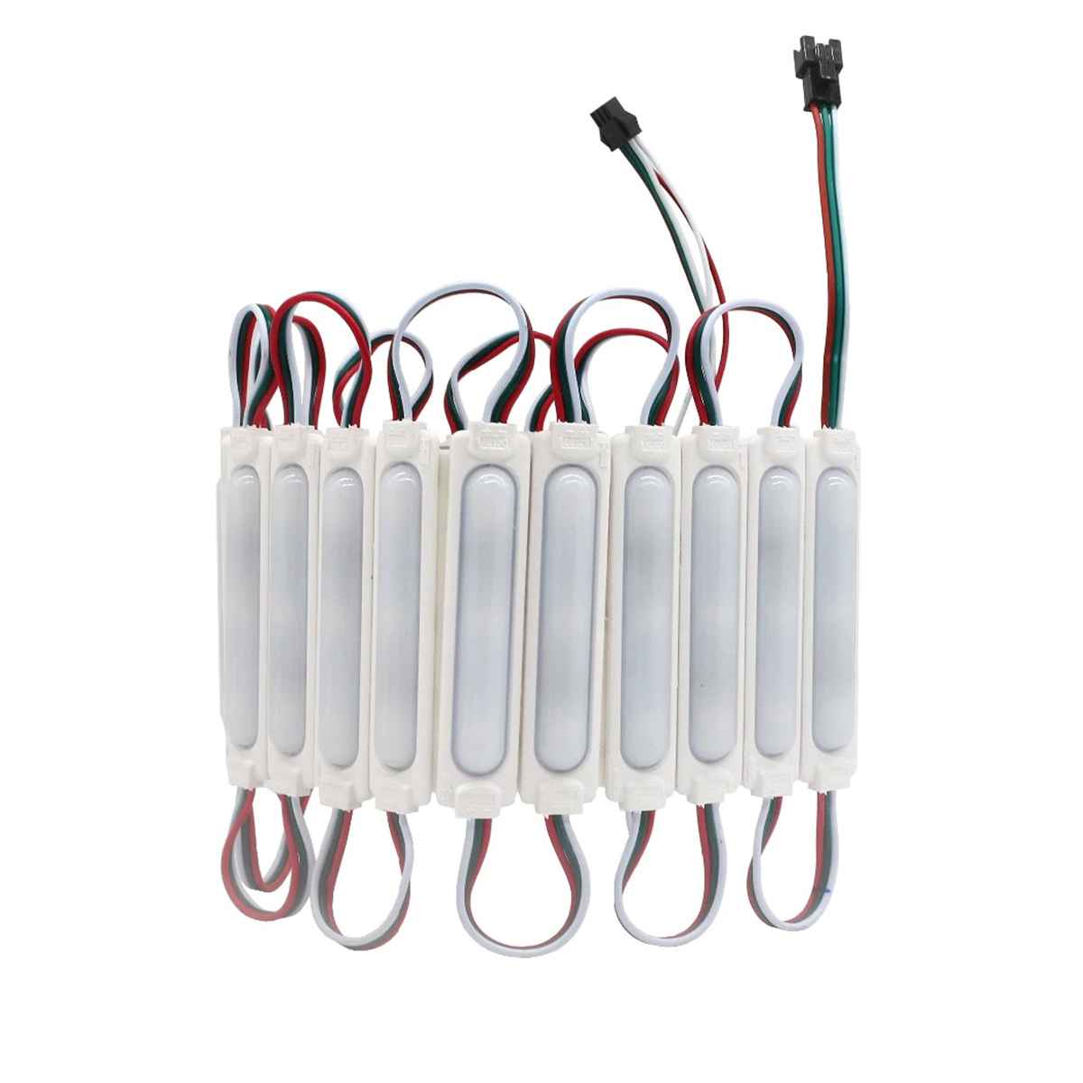 Il modulo si alimenta a 12V tramite alimentatore (non incluso) I moduli sono collegati da un cavo a 3 fili il rosso è per la tensione a 12V, il bianco la terra ed il verde per i dati. I moduli LED sono in plastica completamente adatti anche per uso esterno con grado di protezione IP65. Ogni pixel è controllato digitalmente in modo singolo, possiamo impostare.