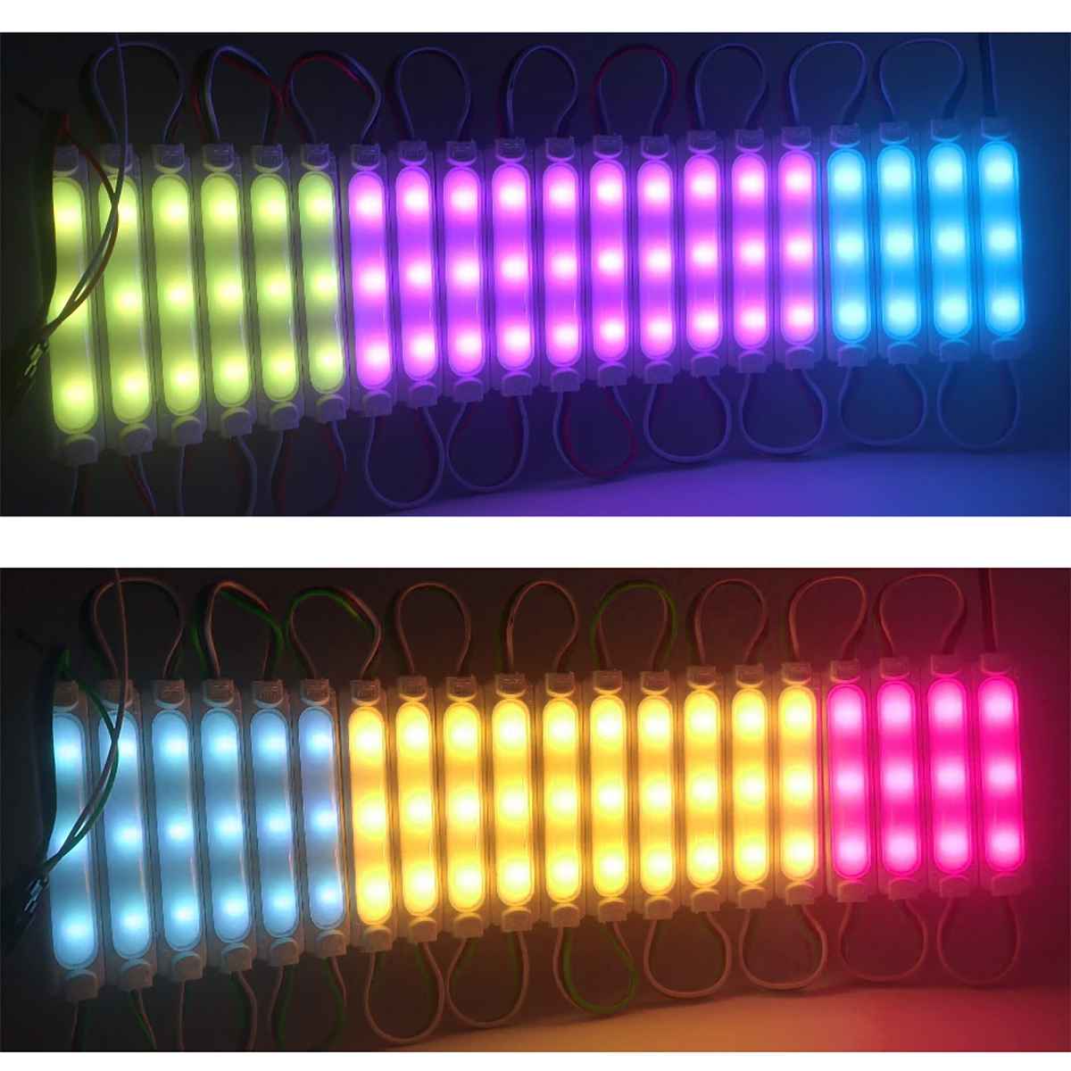 Modulo LED RGB digitale completo di centralina e telecomando per gestire tutti gli effetti ideale come retroilluminazione di tabelle, tabelloni, insegne pubblicitarie, insegne di negozi, tabelloni pubblicitari, all'interno di vetrine. Il modulo è composto da 20 LED da 1W con potenza totale di 20W ed è dotato di adesivo per un facile il fissaggio su superfici piane. Possiamo impostare qualsiasi colore oppure scegliere un effetto luminoso tra quelli già perimpostati.