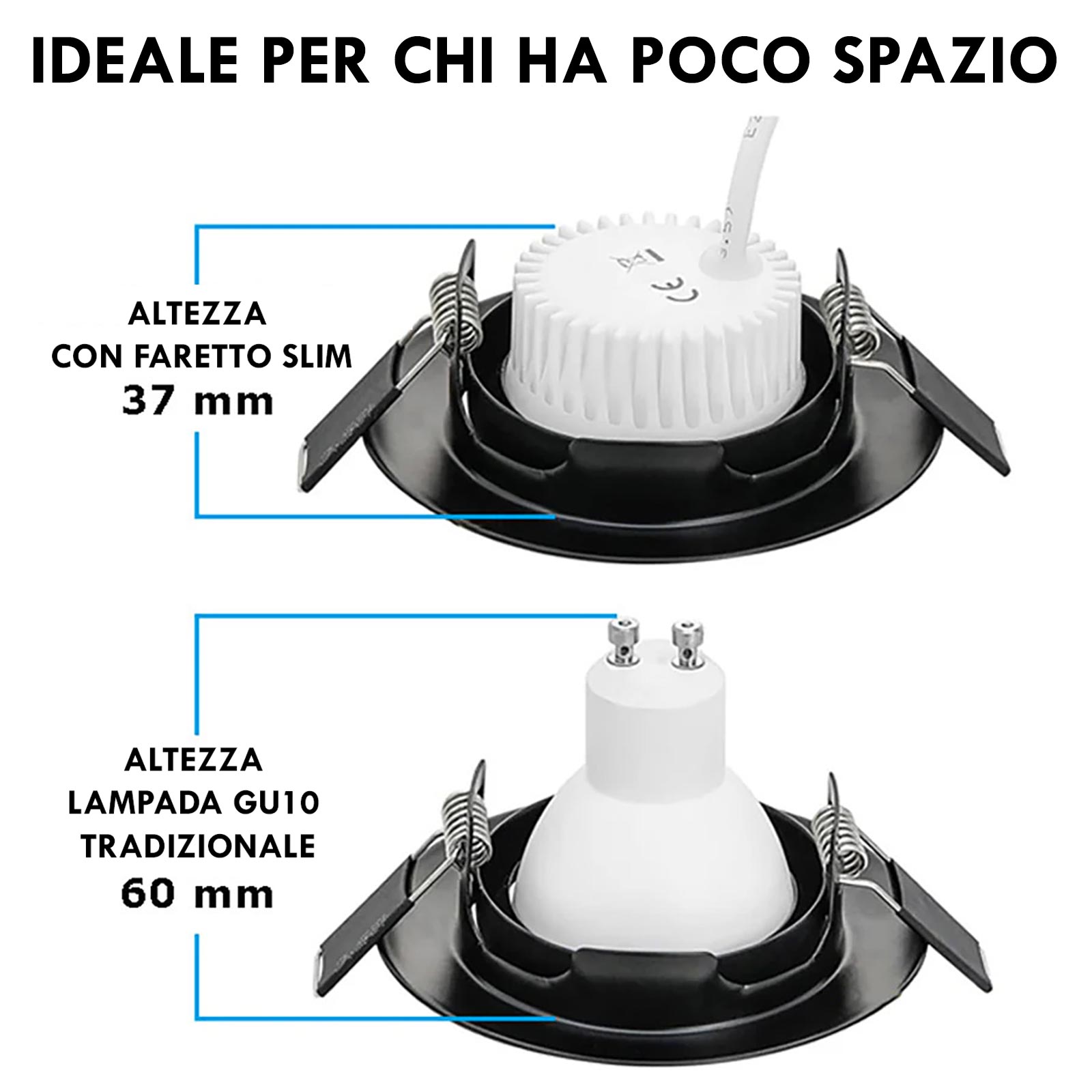 La sua altezza ridotta di soli 37 mm lo rende ideale per controsoffitti con poca profondità, inclusi quelli in cartongesso, dove i faretti tradizionali GU10 o MR16 non trovano spazio. Il design minimalista si accompagna a prestazioni luminose di alto livello con un flusso di 510 lumen. Disponibile con angolo di luce da 38 gradi che garantisce una luce intensa e concentrata, perfetta per valorizzare ambienti domestici o commerciali con precisione e stile, e con angolo di 110 gradi con diffusore opaco per una luce più diffusa.