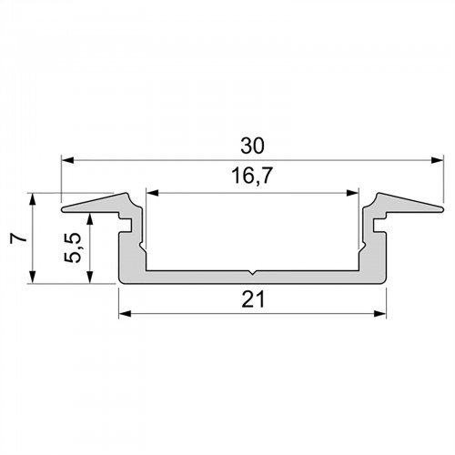 Profilo in alluminio modello a T FLAT adatto per ospitare strisce LED. Questo profilo è ideale per essere installato ad incasso nel legno o su altre superfici piane. Il profilo è disponibile in diverse misure: 1000mm e 2000mm e larghezza da 9mm fino a 21mm con altezza che varia da 6mm a 7mm.