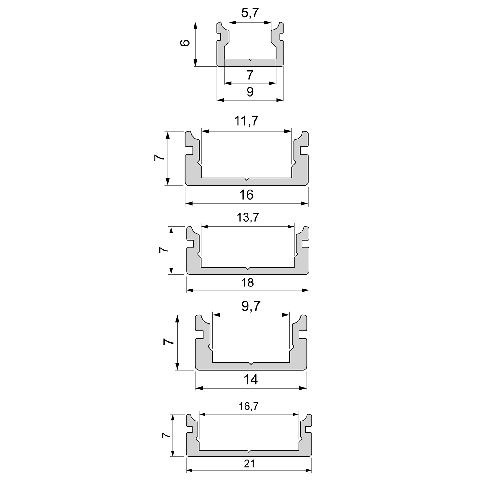 Profilo in alluminio modello a T FLAT adatto per ospitare strisce LED. Questo profilo è ideale per essere installato ad incasso nel legno o su altre superfici piane. Il profilo è disponibile in diverse misure: 1000mm e 2000mm e larghezza da 9mm fino a 21mm con altezza che varia da 6mm a 7mm.