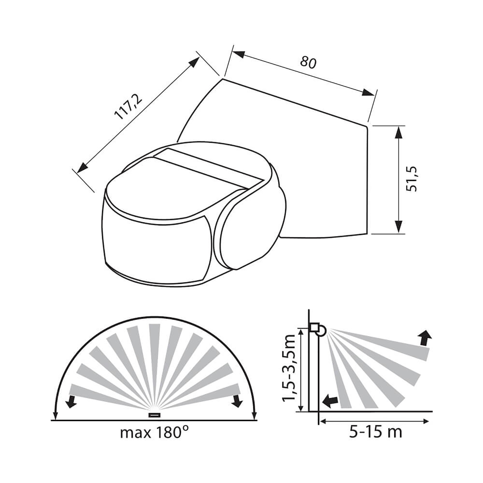 Il sensore ha un grado di protezione IP65 che lo rende adatto per uso esterno resistente alle intemperie e gli agenti atmosferici. L'installazione avviene a fissaggio a parete o soffitto in quanto il sensore ha la testa inclinabile sia in vericale che in orizzontale per direzionarlo sencondo le proprie esigenze.