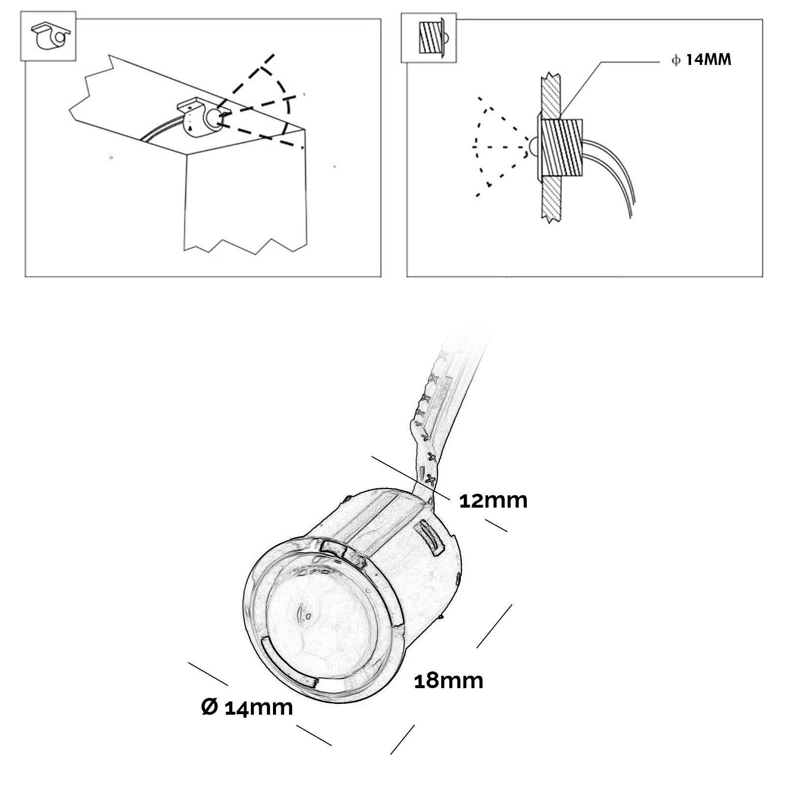 Dimensioni centralina: 50mm x 30mm x 10mm - Dimensioni sensore: 18mm x 12mm x Ø 14mm
