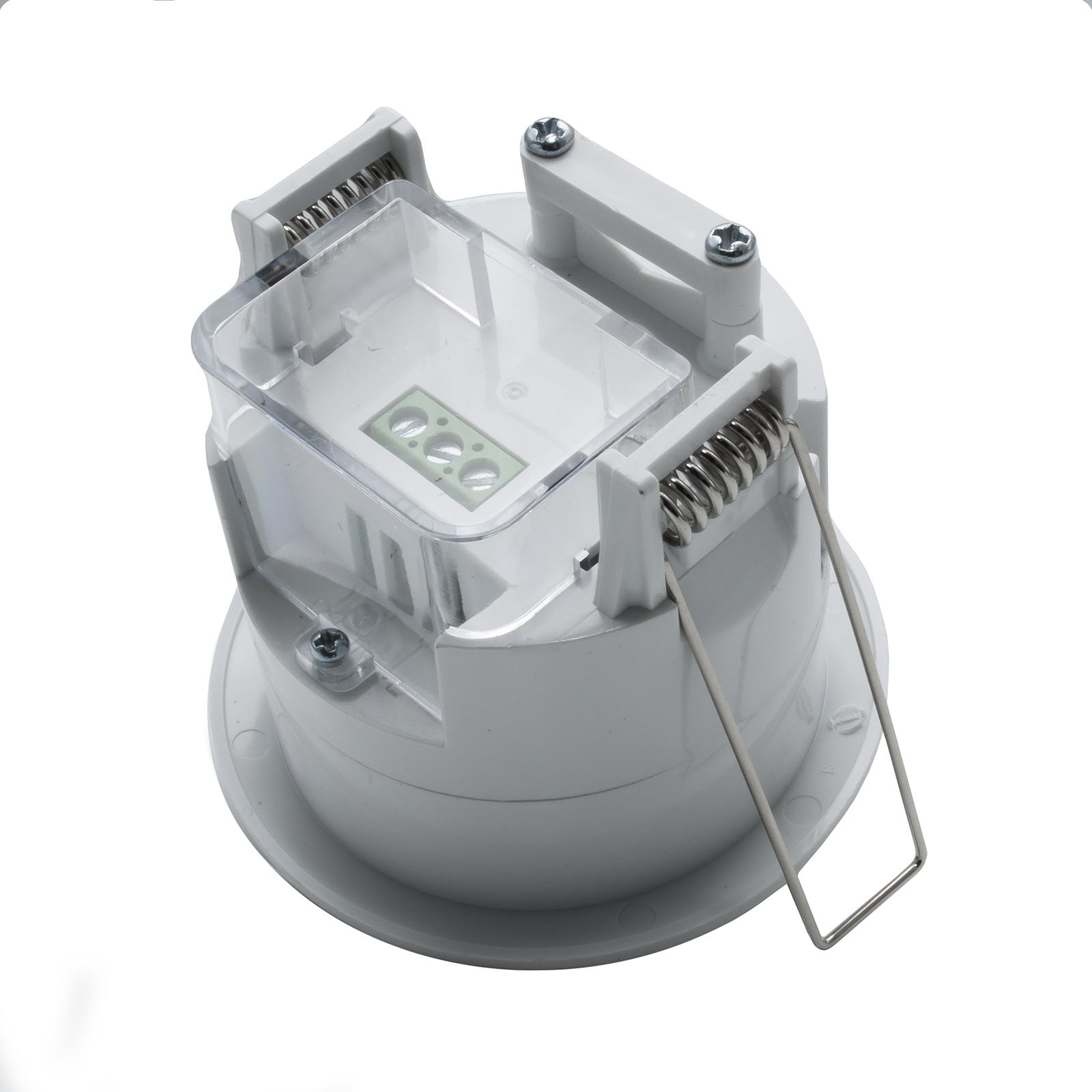 Sensore di movimento ad incasso ideale per pilotare lampade a led o tradizionali, porte di garage, cancelli, grazie al sistema ad incasso a molla con alette potete inserirlo semplicemente nel controsoffitto. Il sensore permette la regolazione del tempo di accensione luci ed inoltre dispone di sensore crepuscolare integrato con regolazione soglia di intervento.