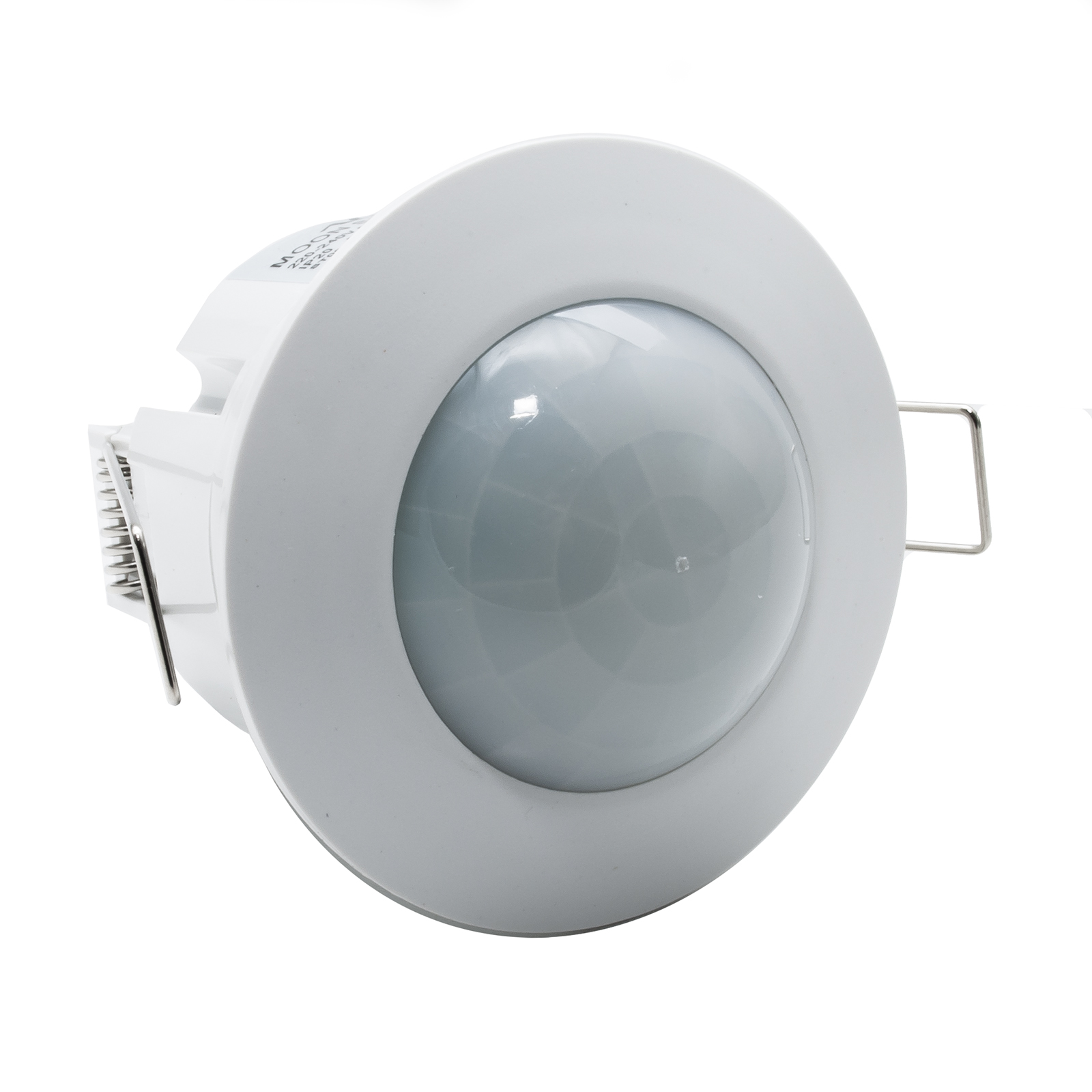 Sensore di movimento ad incasso ideale per pilotare lampade a led o tradizionali, porte di garage, cancelli, grazie al sistema ad incasso a molla con alette potete inserirlo semplicemente nel controsoffitto. Il sensore permette la regolazione del tempo di accensione luci ed inoltre dispone di sensore crepuscolare integrato con regolazione soglia di intervento.