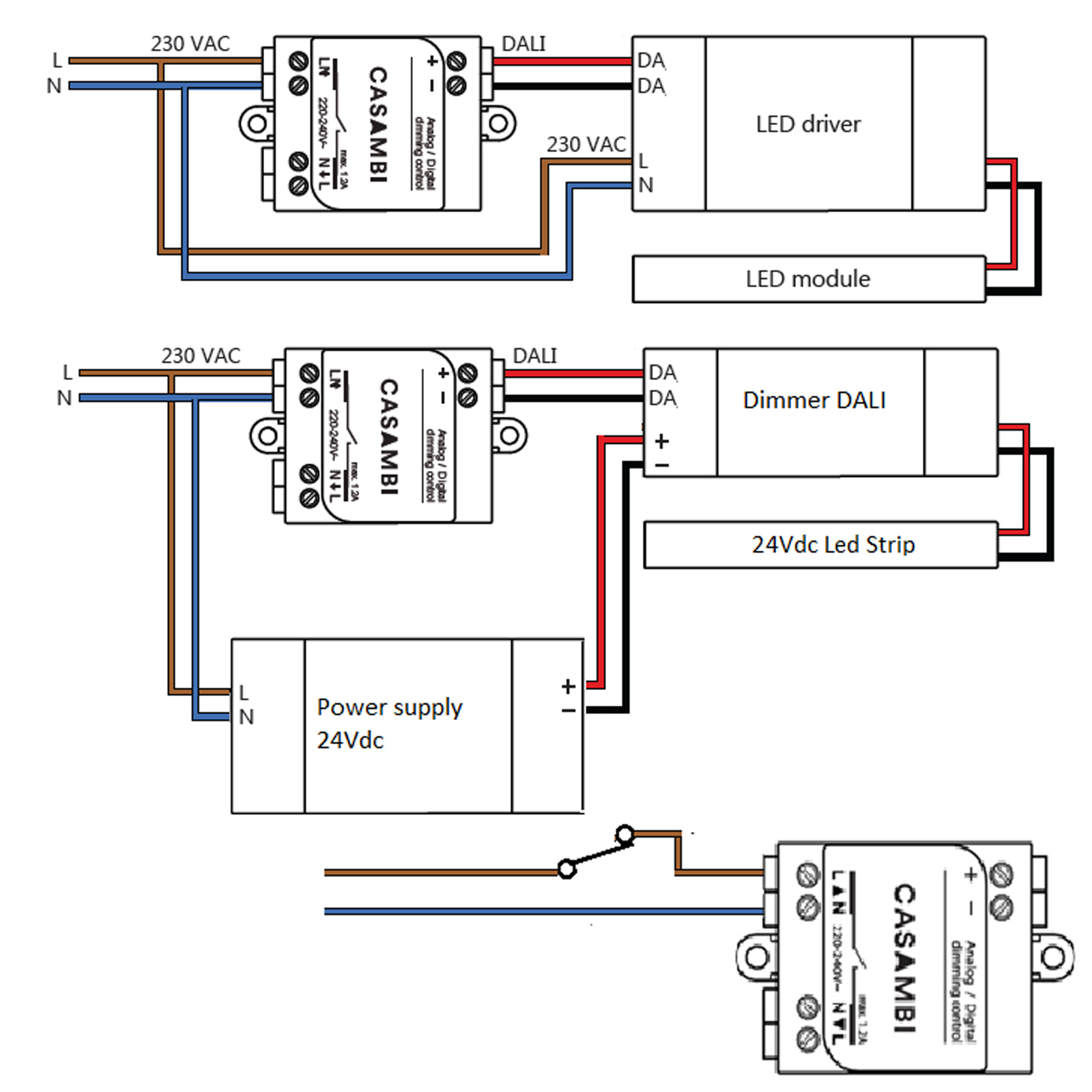 Quando l'uscita è configurata come DALI Standalone, il CBU-ASD agisce sia come controller sia come fonte di alimentazione, permettendo il collegamento diretto a un driver LED con interfaccia DALI senza l'ausilio di un alimentatore DALI esterno. Il cosiddetto DALI Standalone consente di implementare sistemi di illuminazione multicanale con colore (RGB) o temperatura colore regolabile, mantenendo al minimo il cablaggio e il numero di componenti.