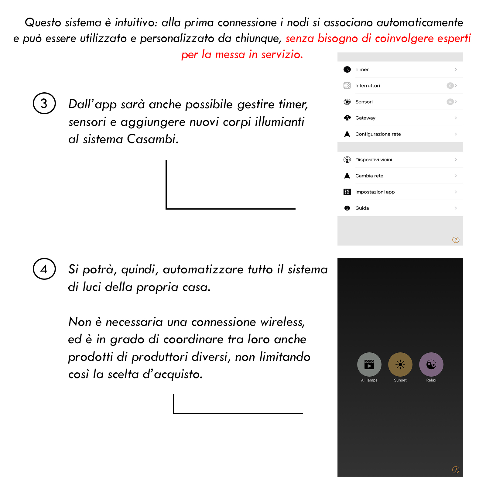 Questo sistema è intuitivo: alla prima connessione i nodi si associano automaticamente e può essere utilizzato e personalizzato da chiunque, senza bisogno di coinvolgere esperti per la messa in servizio.