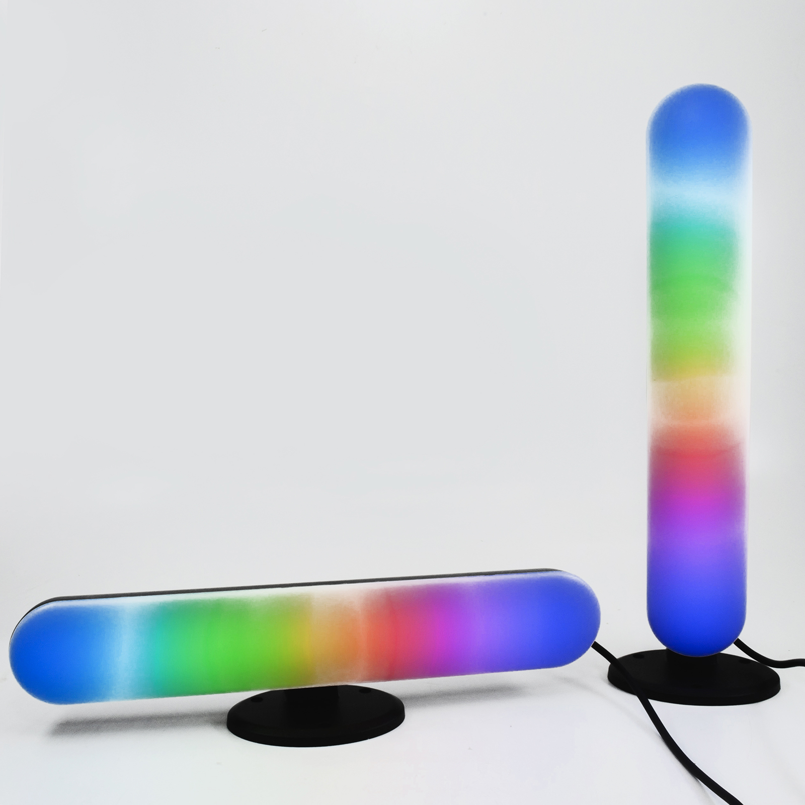 Particolare lampada LED da tavolo composta da 2 lampade con tecnologia SMART LED RGBIC con potenza 5W adatta da posizionare su scrivanie e tavoli per creare fantastici effetti di luce colorata o per la cromoterapia di camerette per bambini, camere da letto ed in tutti quei posti dove si vuole dare un effetto particolare all'ambiente. La lampada è realizzata plastica è dotata di telecomando per gestire le funzioni. Grazie alla tecnologia RGBIC con lampade possiamo ottenere colori differenti contemporaneamente, creando particolari sfumature. Ma non solo grazie a questa lampada possiamo ottenere anche la luce bianca.