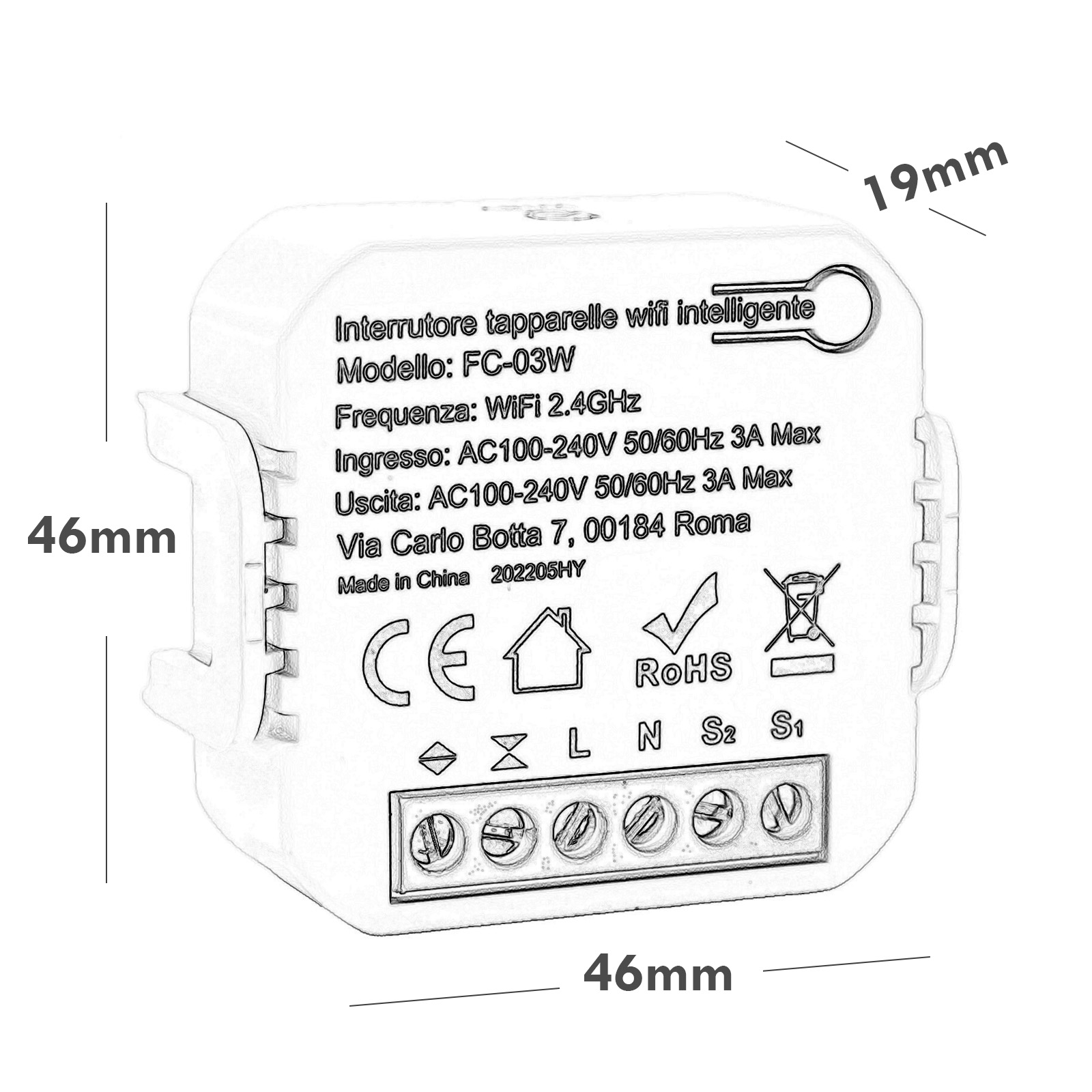 MODELLO: FC-03W - Dimensioni interruttore: 46mm x 46mm x 19mm.