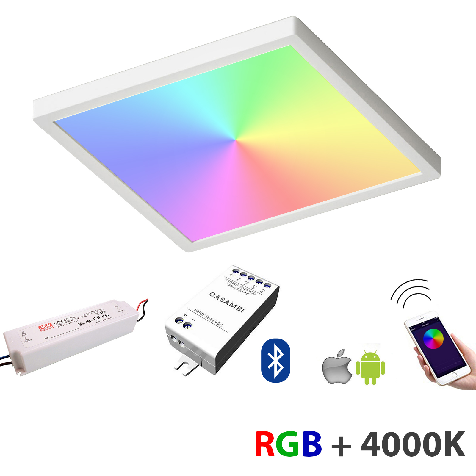 KIT plafoniera RGBW dotata di cornice per il fissaggio a soffitto completa di alimentatore e dispositivo CASAMBI bluetooth LOW ENERGY. La plafoniera è dotata ad alta luminosità con una potenza di 48W. Il pannello ha un angolo di luce ampio di 120 gradi. Questo tipo di led ha un rendimento davvero eccezionale. Si alimenta a 24W con trasformatore (incluso)