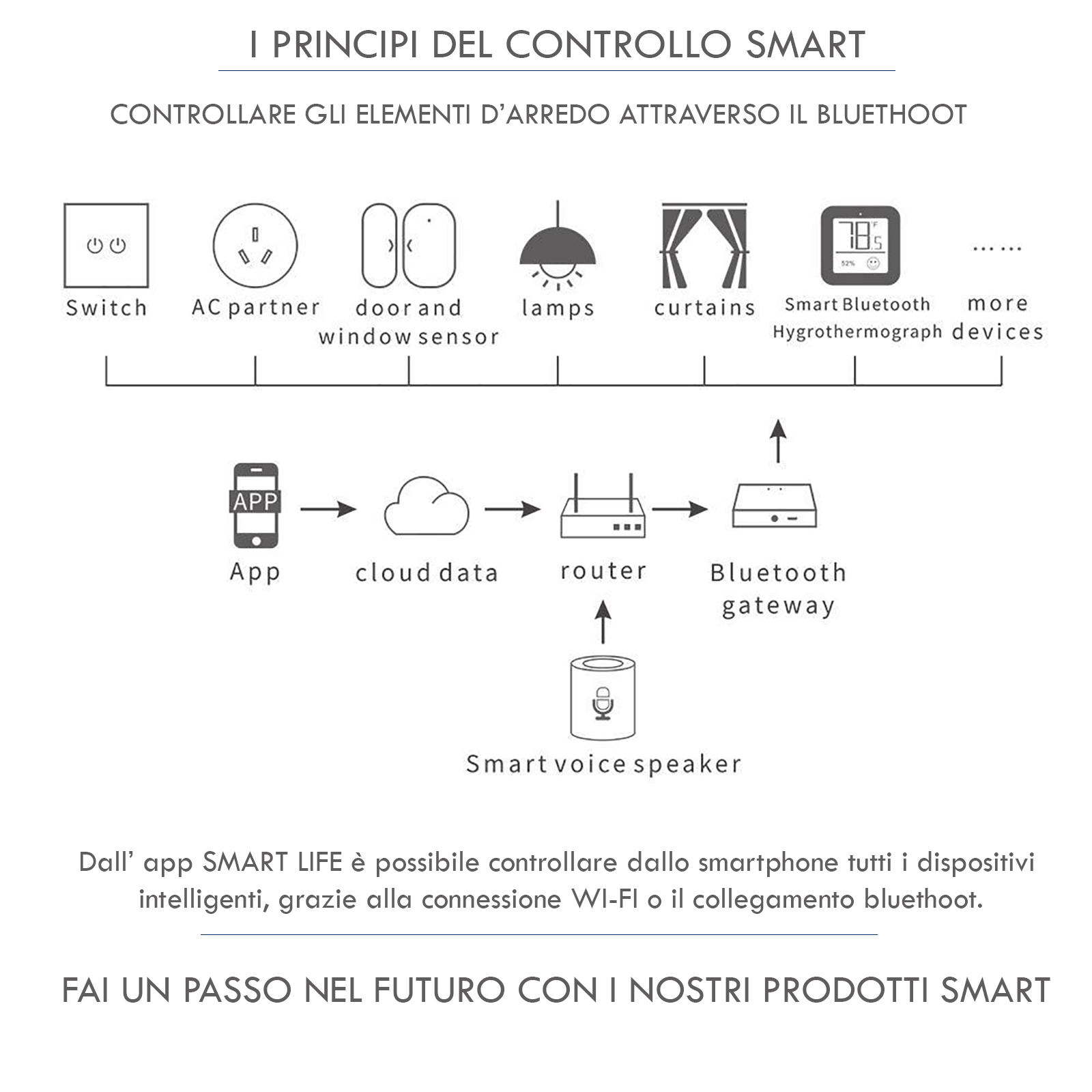 Compatibile con Amazon Alexa e Google Home, attraverso l'APP possiamo creare delle APPLETS che ci consentono di attivare altri dispositivi in caso di forte umidità o bassa temperatura, ad esempio possiamo impostare una soglia di umidità oltre la quale deve accendersi il deumidificatore, oppure impostare una temperatura sotto la quale devono accendersi i riscaldamenti.