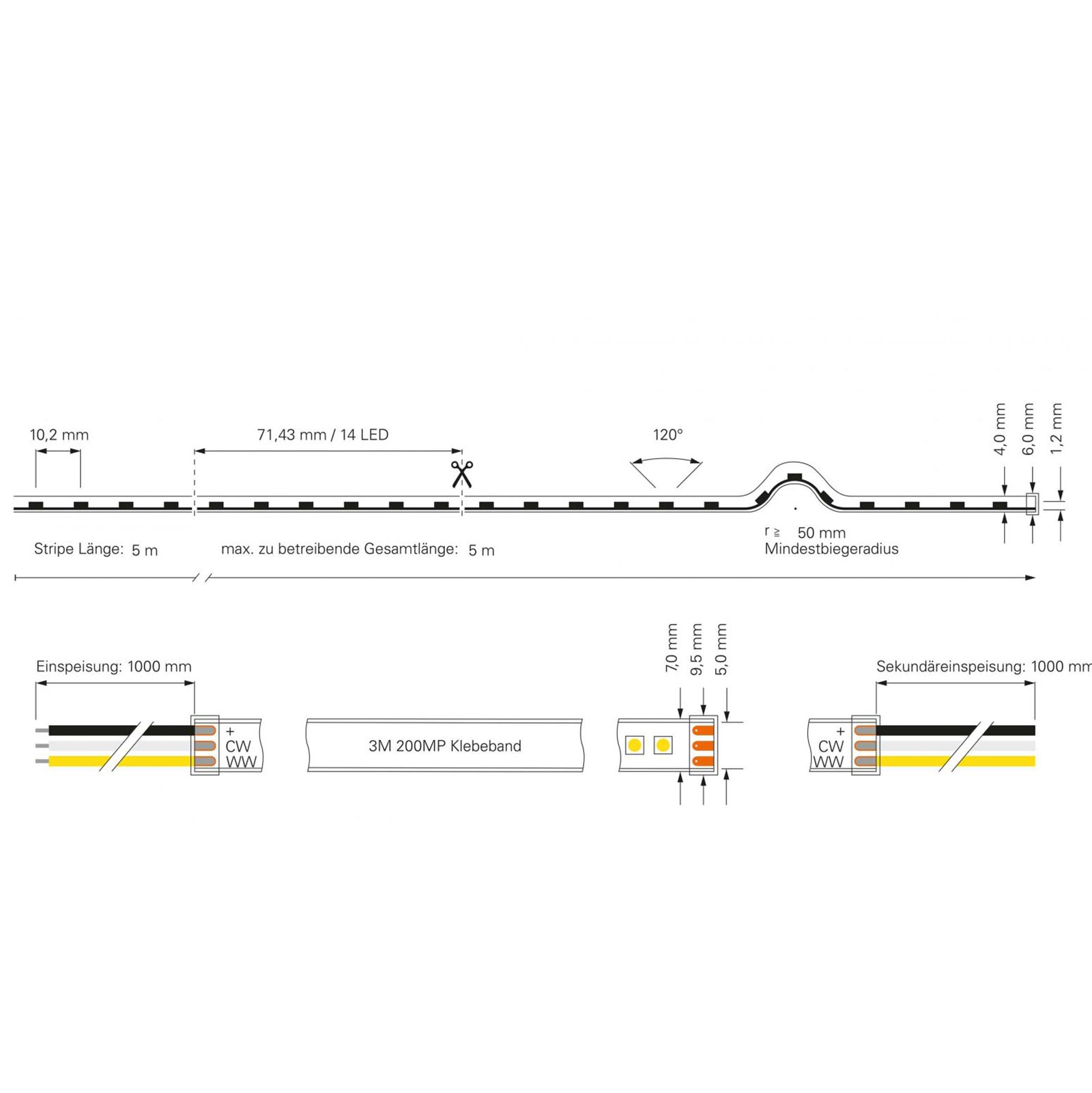 La striscia ha un angolo di luce diffuso di 120 gradi con una resa cromatica maggiore di 90 indice di qualità - Per gestire tutte le funzioni e per cambiare la temperatura luce, la striscia necessita di una centralina CCT (non inclusa), attraverso la centralina è possibile anche dimmerare l'intensità della luce. Possibilità di collegarla a centraline WiFi per gestirla da remoto o tramite gli assistenti vocali.