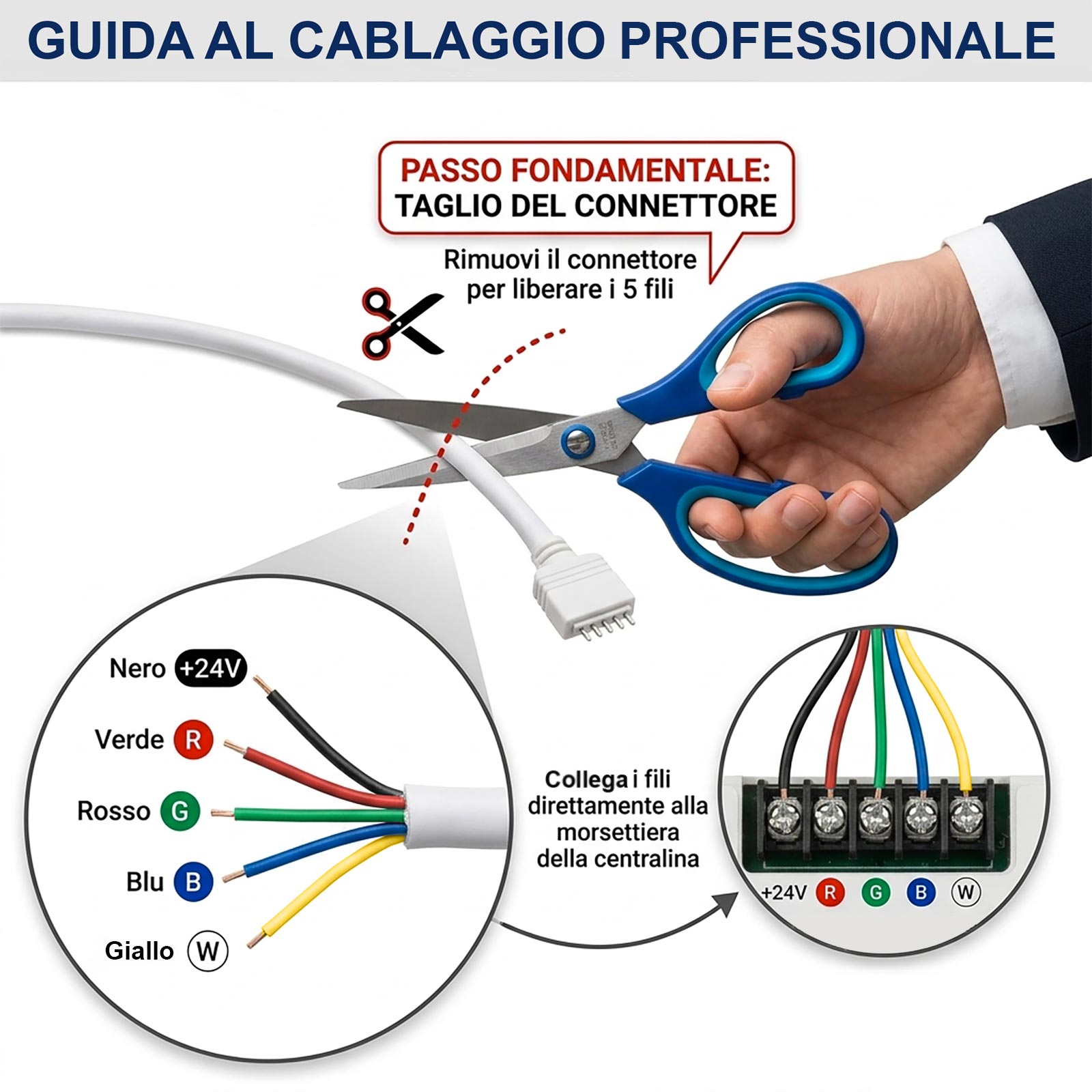 Nota Tecnica: Per il collegamento alla centralina inclusa, è necessario tagliare il connettore pre-installato della striscia per rivelare i 5 fili (R, G, B, W, +) e inserirli nei morsetti della centralina.