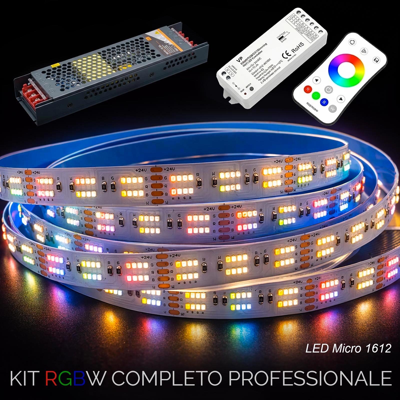 Crea l'atmosfera perfetta con il nostro Kit LED RGBW Professionale. Questa soluzione "chiavi in mano" combina una striscia LED RGBW con Micro LED 1612 ad alta efficienza energetica ad elevata luminsità, un controller RF con telecomando e un alimentatore slim, ideale per chi cerca un'illuminazione sia scenografica (con luce colorata) sia funzionale (bianco naturale per l'illuminazione tradizionale).