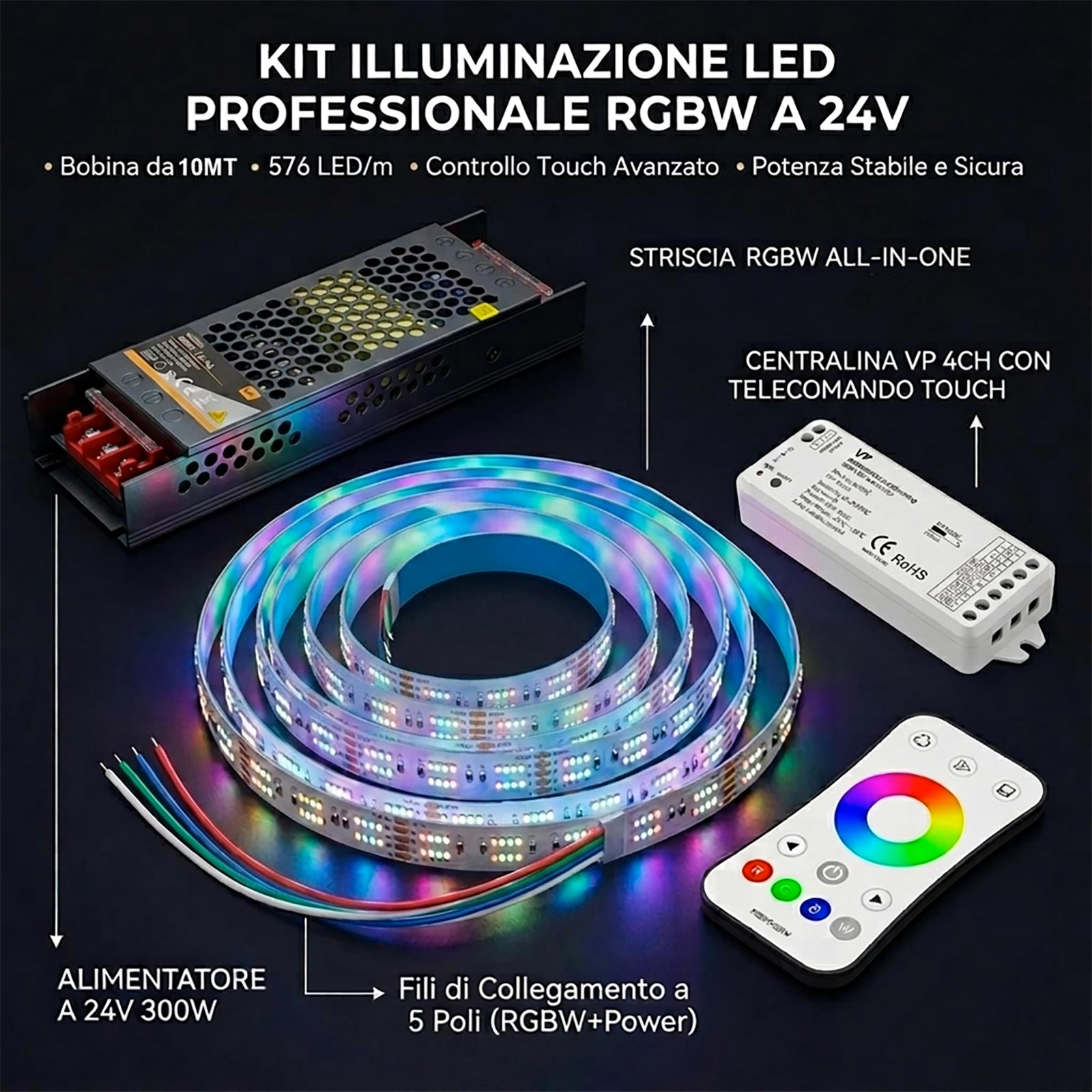 KIT Striscia LED RGBW 10m Professional: 576 LED/m + Centralina RF + Alimentatore 300W