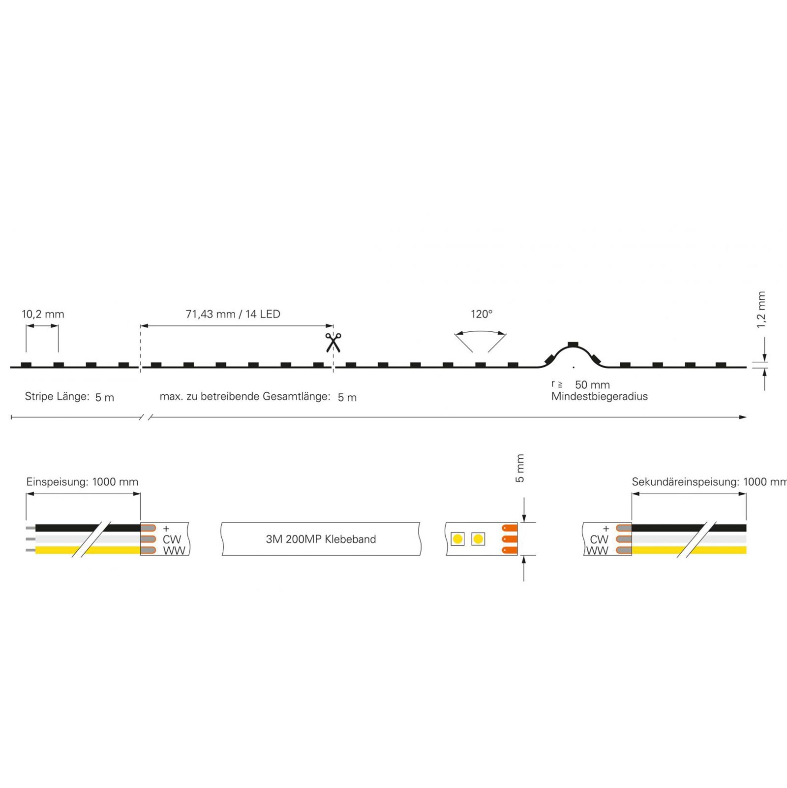 La striscia ha un angolo di luce diffuso di 120 gradi con una resa cromatica maggiore di 90 indice di qualità - Per gestire tutte le funzioni e per cambiare la temperatura luce, la striscia necessita di una centralina CCT (non inclusa), attraverso la centralina è possibile anche dimmerare l'intensità della luce. Possibilità di collegarla a centraline WiFi per gestirla da remoto o tramite gli assistenti vocali.