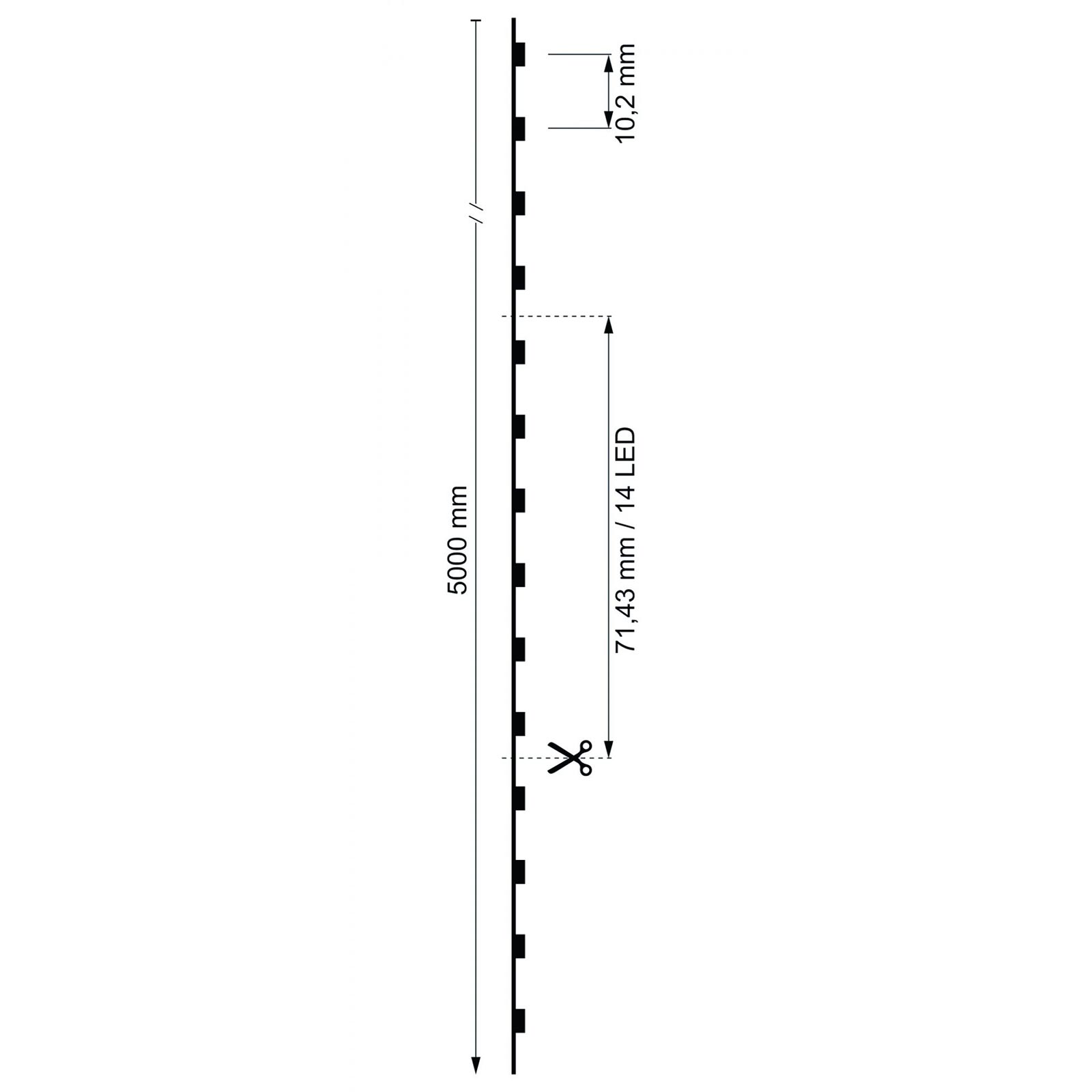 Inoltre questa striscia ha un indice di resa cromatica maggiore di 90 questo consente un'illuminazione ottimale che non altera i colori, ideale per illuminare negozi di tessuti e vestiti. Viene fornita in bobina da 5 metri inoltre è possibile tagliarla ogni 14 LED (71,43mm) come segnalato sulla striscia tramite l'apposito segno di taglio.