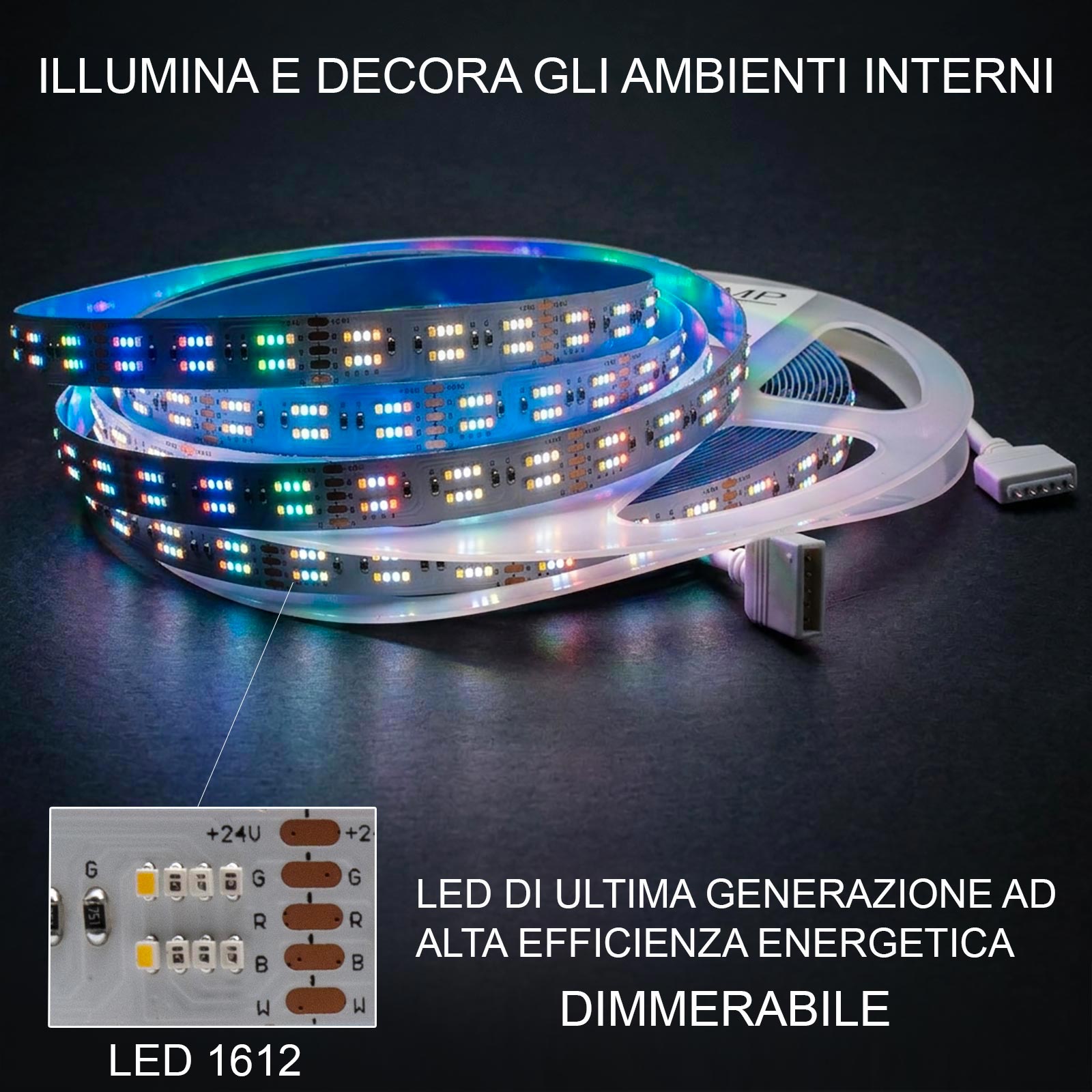 Questa striscia monta dei LED di ultima generazione ad alta efficienza energetica 1612, I LED 1612 appartengono alla categoria dei chip ultra-compatti. Vengono utilizzati quando lo spazio sul circuito stampato (PCB) è estremamente ridotto. La striscia è dimmerabile (tramite centralina non inclusa).