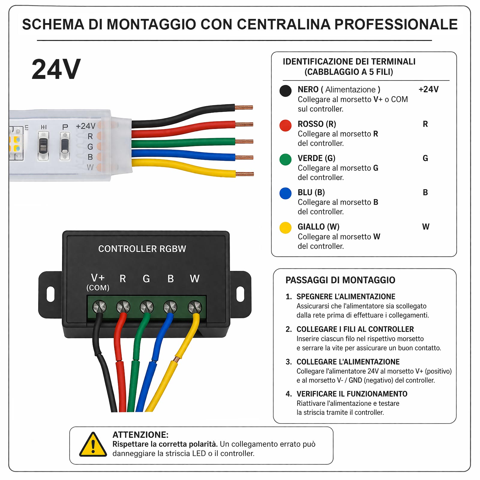 PER IL COLLEGAMENTO A CENTRALINE PROFESSIONALI VA TAGLIATO IL CONNETTORE PER OTTENRE I 5 FILI DA INSERIRE NELLA CENTRALINA