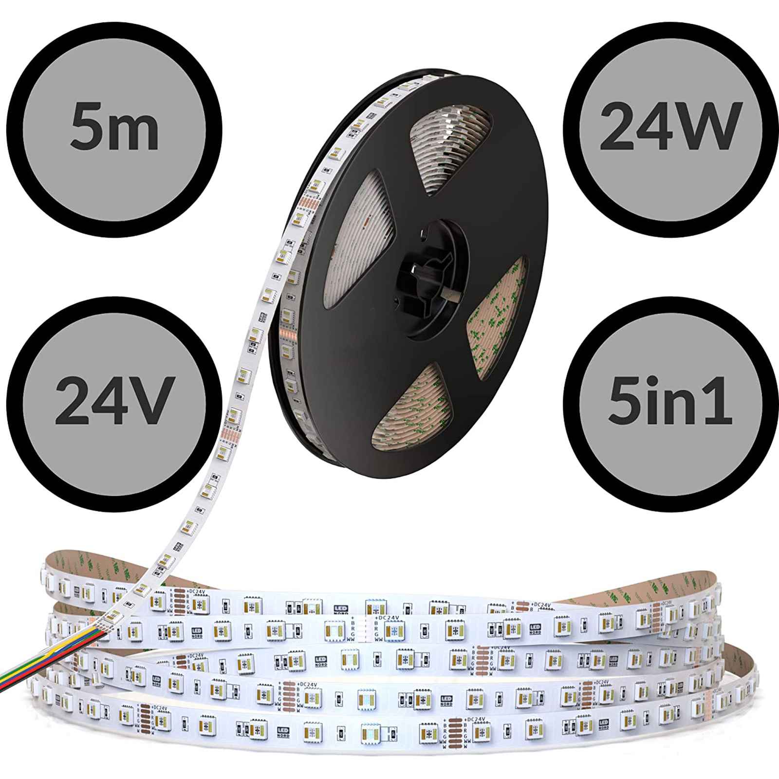 Si alimenta a bassa tensione tramite alimentatore a 24V (alimentatore non incluso) ed ha una potenza di 24W per metro, inoltre grazie ai LED 5050 ad alta luminosità questa striscia ha un'intensità luminosa di 2400 lumen /m per un'intensità complessiva di 12000 lumen. Estremamente flessibile sul retro è presente un potente adesivo 3M che consente di fissare la striscia su superfici piane.