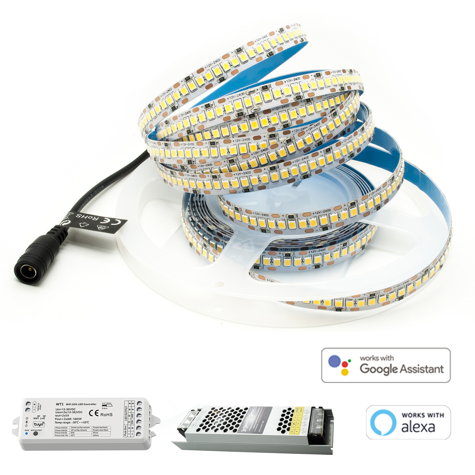 KIT composto da una striscia LED monocolore da 90W con alimentazione a 12V - una centralina smart con tecnologia WiFi e controllo vocale ed un alimentatore slim da 100W a 12V.
