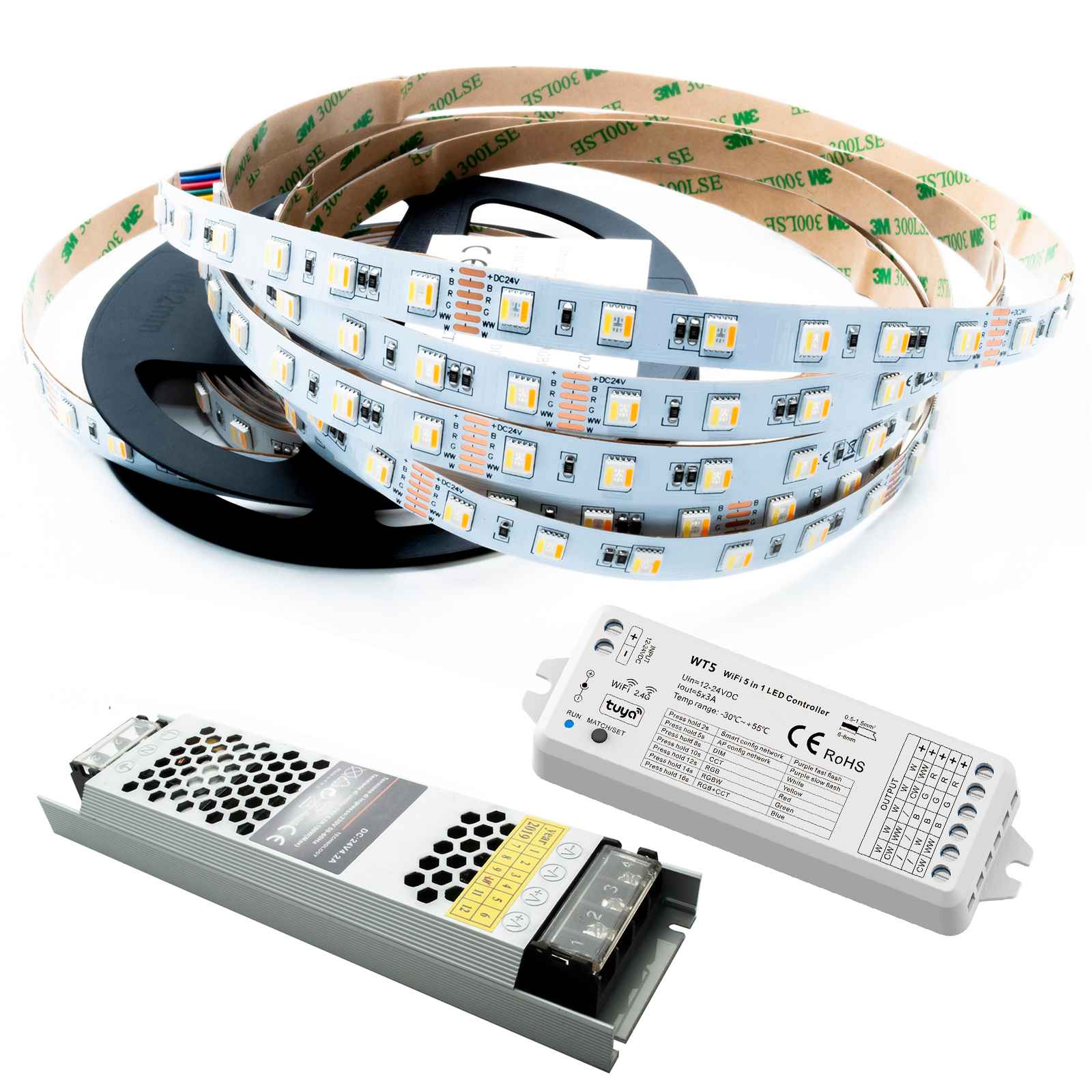 KIT SMART WiFi composto da una striscia LED RGB CCT, un alimentatore a 24V da 100W ed una centralina SMART WiFi RGB CCT che consente di controllare la striscia da remoto tramite lo smartphone oppure tramite gli assistenti vocali Amazon Alexa e Google Home.