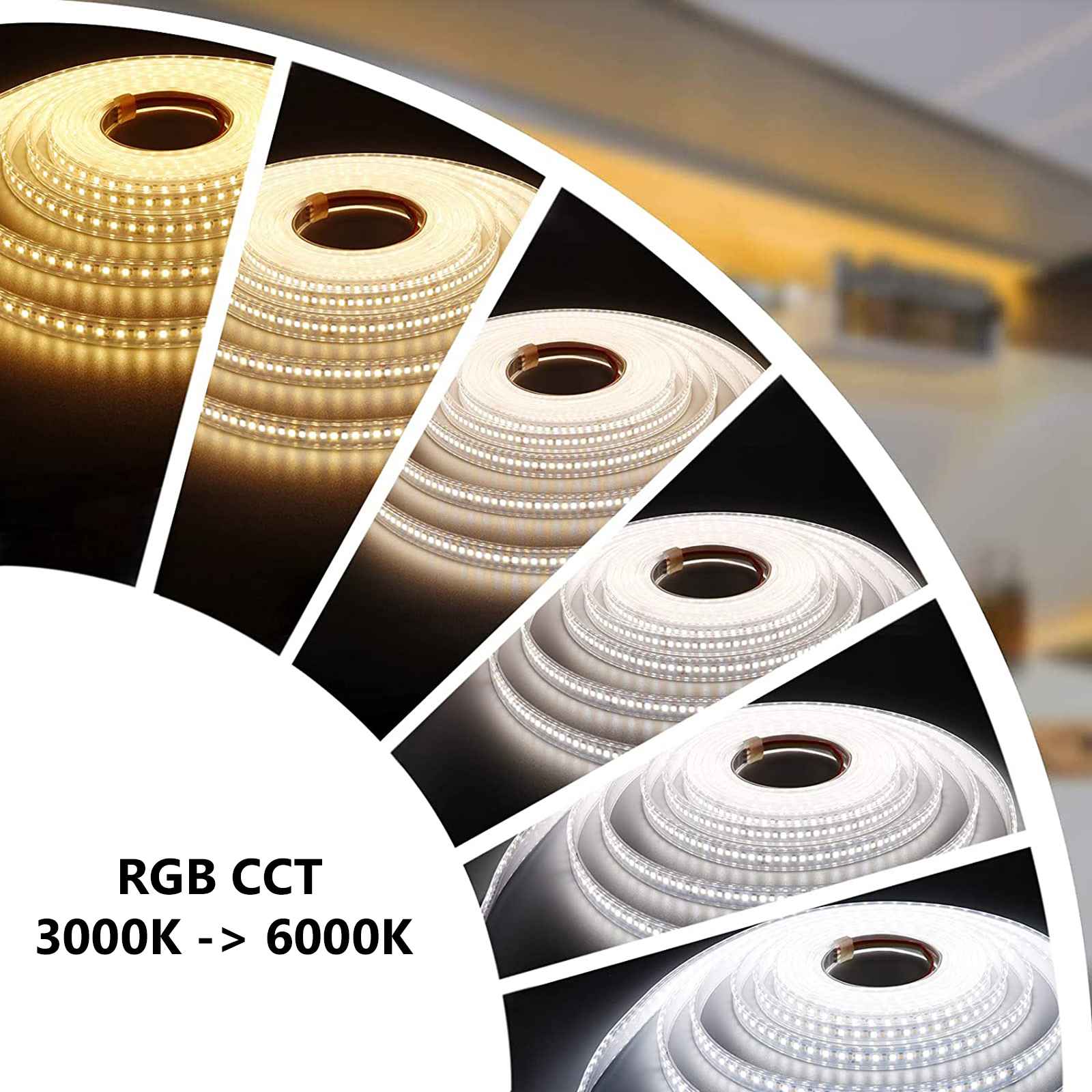 Striscia adesiva dotata di 300 LED con tecnologia RGB CCT che conentono l'emissione sia di luce colorata sia luce da 3000K a 6000K ideale per ambienti interni per la decorazione di soffitti, pareti, per delineare perimetri di ambienti interni, adatta anche da inserire in profili di alluminio per l'illuminazione di bar, pub, ristoranti, abitazioni, ed in tutti quei posti dove oltre a creare effetti di luce colorata si vuole allo stesso tempo illuminare, utilizzando a proprio piacimenti sia la luce calda sia la luce fredda.