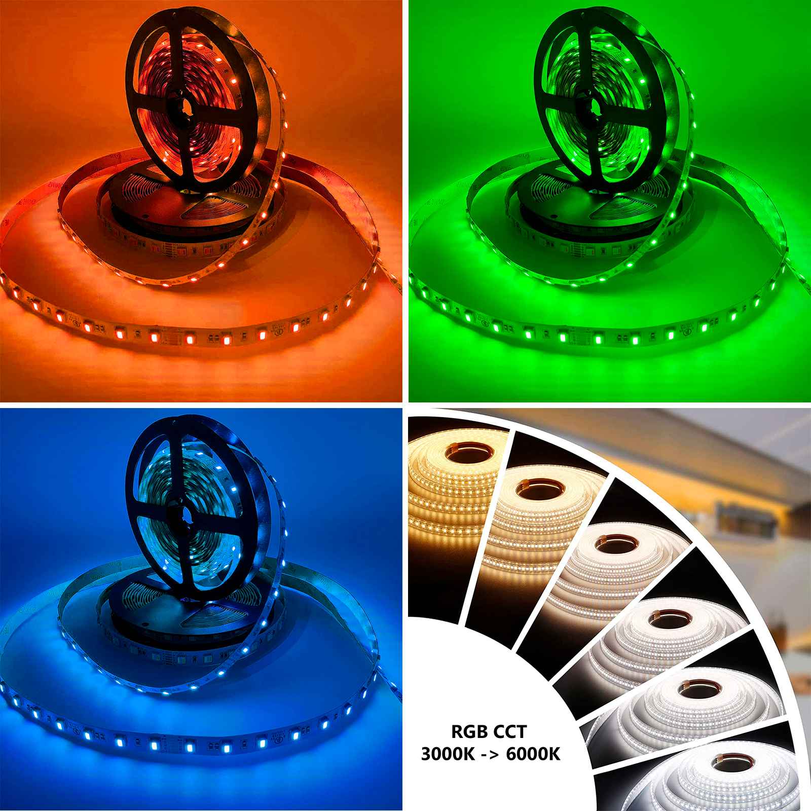Striscia adesiva dotata di 300 LED con tecnologia RGB CCT che conentono l'emissione sia di luce colorata sia luce da 3000K a 6000K ideale per ambienti interni per la decorazione di soffitti, pareti, per delineare perimetri di ambienti interni, adatta anche da inserire in profili di alluminio per l'illuminazione di bar, pub, ristoranti, abitazioni, ed in tutti quei posti dove oltre a creare effetti di luce colorata si vuole allo stesso tempo illuminare, utilizzando a proprio piacimenti sia la luce calda sia la luce fredda.