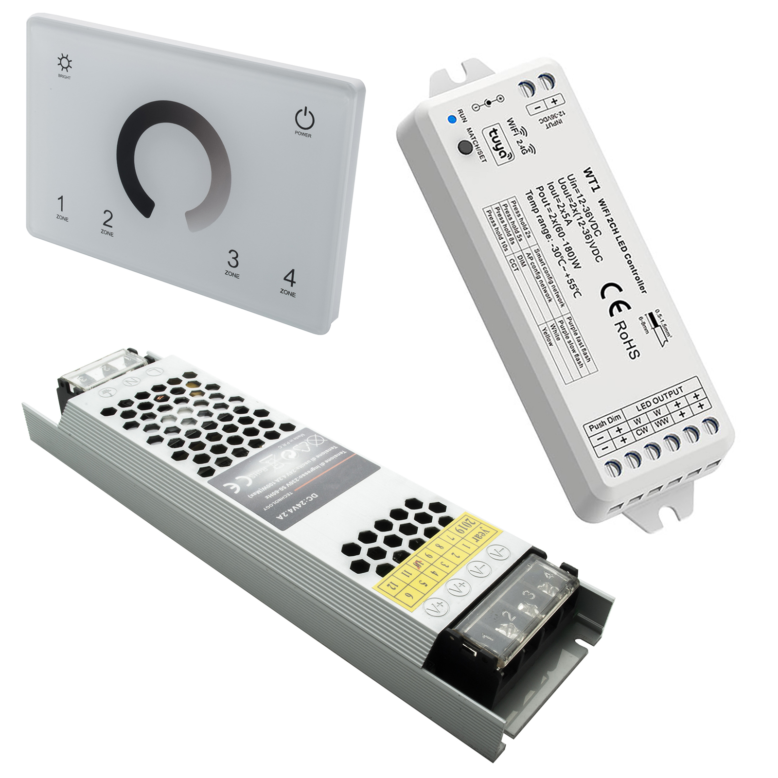 La centralina si alimenta a 12V/24V ed è dotata di 2 canali supporta un carico massimo per canale di 5A (Totale corrente: 10A). Il controller ha una potenza di 60W / 180W (120-360W potenza totale). Dotato di interruttore che consente la sincronizzazione con centraline, telecomandi, router. Segnale d'ingresso: Tuya App+Amazon Echo+RF 2.4G. Inoltre è presente un LED che a seconda del colore indica il tipo di modalità scelta.