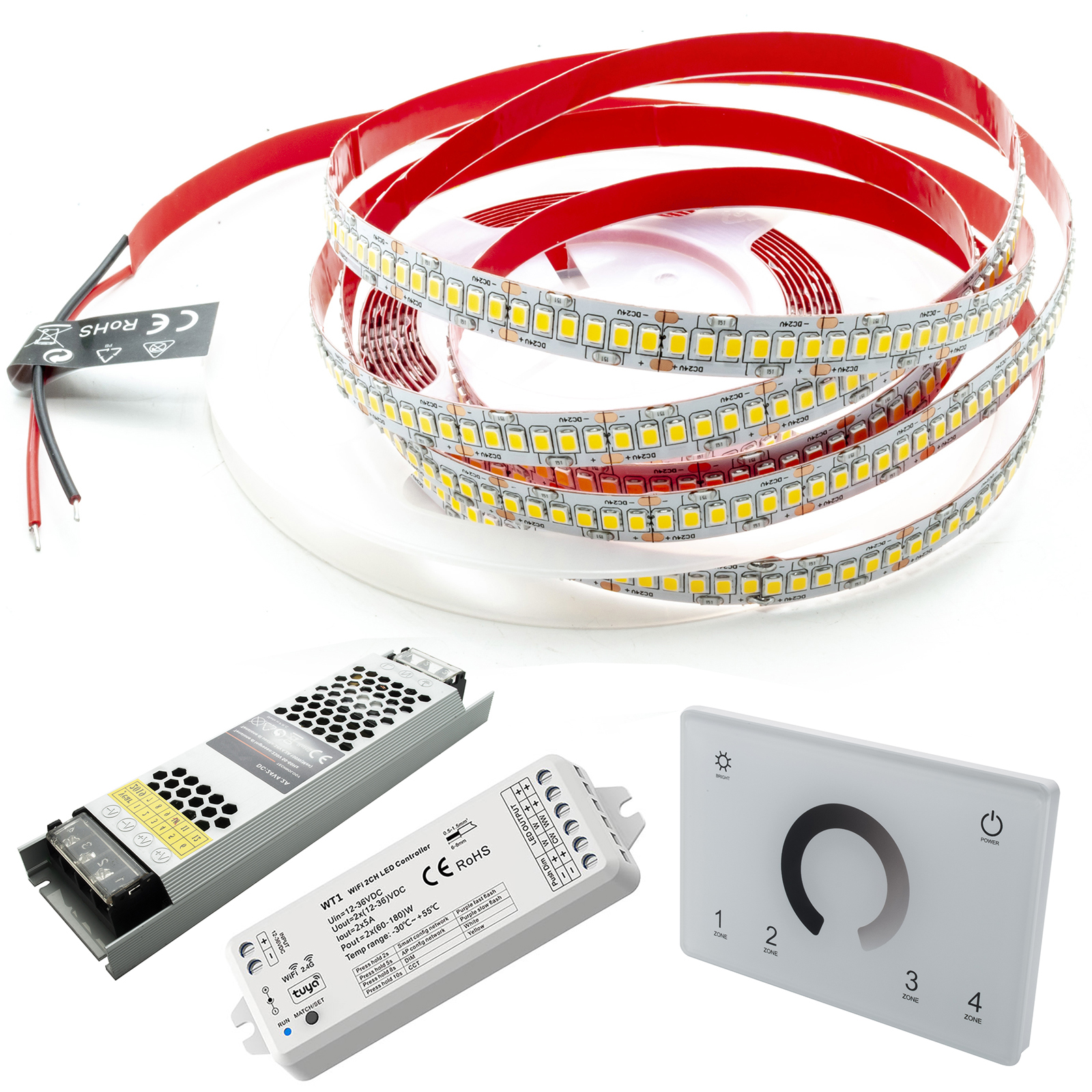 Nel KIT è compreso: Nr. 1 striscia LED, Nr. 1 alimentatore, Nr. 1 centralina WiFi, Nr. 1 Pannello touch.