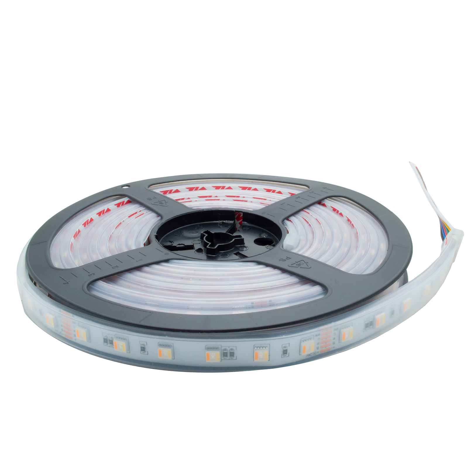 La striscia è equipaggiata di 300 LED di nuova generazione che consente in un solo prodotto di ottenere sia la luce colorata RGB sia la luce bianca da 3000K luce calda a 6000K luce fredda. La striscia si alimenta tramite alimentatore in dotazione a 24Vdc ed ha un'alta resa luminosa di circa 12000 lumen. La striscia si può tagliare ogni 6 LED ogni 10cm tramite gli appositi segni. Dimensioni della striscia: 5000mm x larghezza: 10mm x altezza: 5mm.