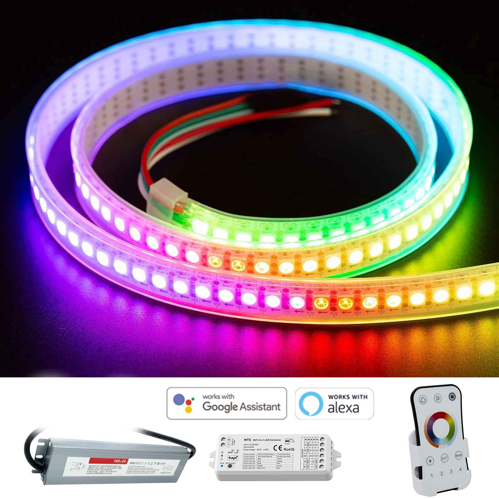 SET SMART composto da una striscia LED RGB CCT, una centralina SMART WiFi, un alimentatore da 100W a 24V ed un telecomando RF. Si alimenta a 24V ed è ideale per l'illuminazione decorativa di spazi esterni come blaconi, terrazzi, giardino, esterni di abitazioni, pergolato e tutti quei posti soggetti alle intemperie e gli agenti atmosferici. Estramamente flessibile sul retro è dotata di adesivo 3M per il fissaggio su superfici piane. Adatta anche da inserire in profili di alluminio per delimitare perimetri, per creare effetti di luce colorata.