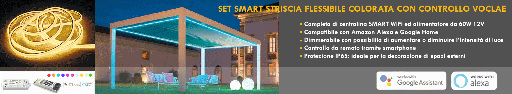 Adatta anche in ambienti con presenza di acqua ed umidità come box doccia, saune, bango turco per creare effetti di luce colorata anche in ambienti interni. Inoltre grazie alla centralina SMART questa striscia può essere controllata anche a distanza sia tramite lo smartphone siam tramite gli assistenti vocali Amazon Alexa e Google Home. Inoltre la centralina consente di dimmerare la striscia aumentando o abbassando l'intensità della luce.