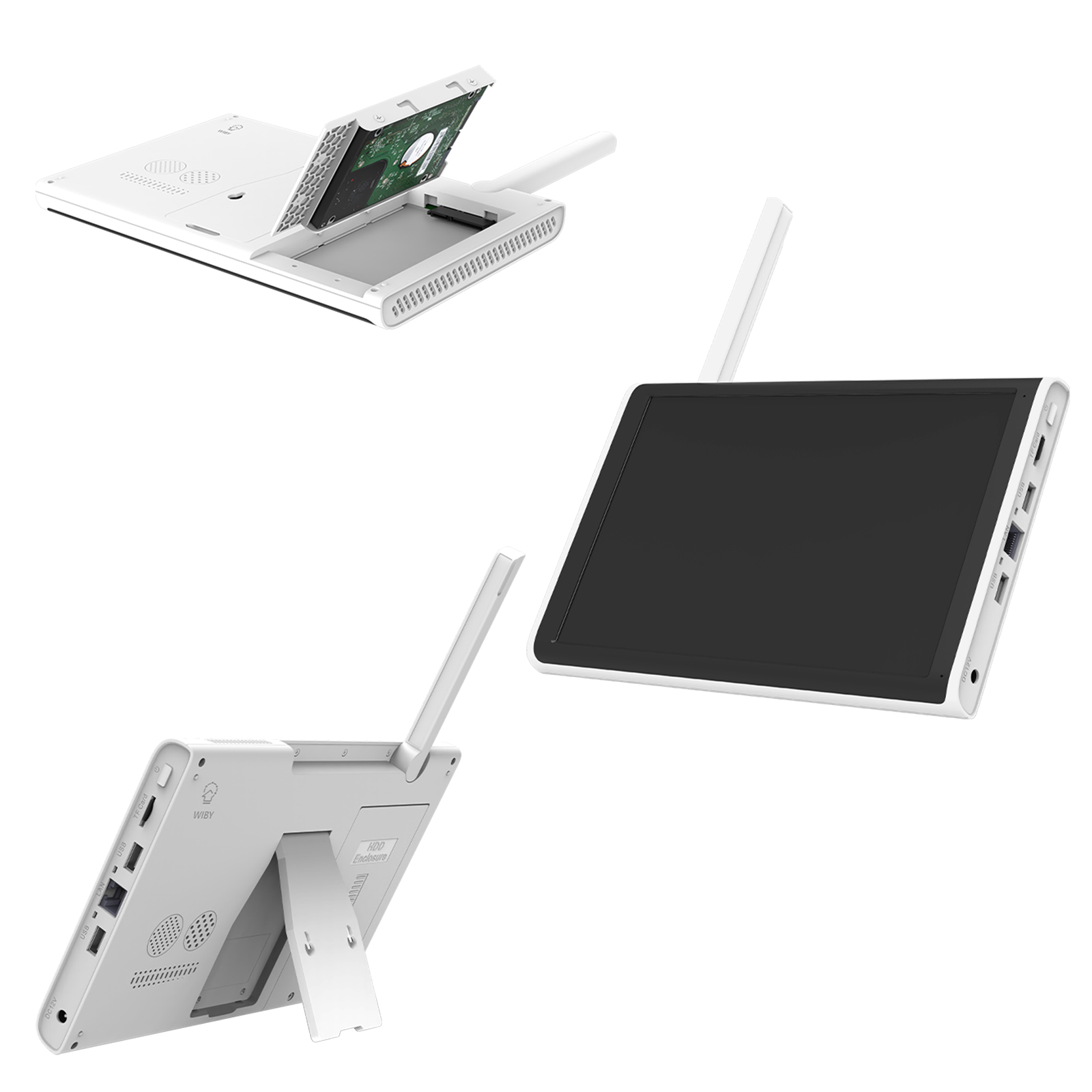 L'NVR in dotazione è dotato di display da 10.1 pollici con una risoluzione di 1280 x 800, sul retro è presente uno sportellino dove alloggia un hard disk meccanico Seagate da 1 TB facilmente sostituibile in caso di malfunzionamenti o per inserirne uno più capiente. Sul lato sono presenti 2 ingressi USB, un'interefaccia LAN, ed un'ingresso per una micro SD CARD, inoltre è presente anche il tasto di accensione e spegnimento. Inoltre questo NVR supporta fino ad 8 telecamere. Questo NVR è dotato di supporto di per poggiarlo su di una superfice piana oppure possiamo fissarlo al muro.